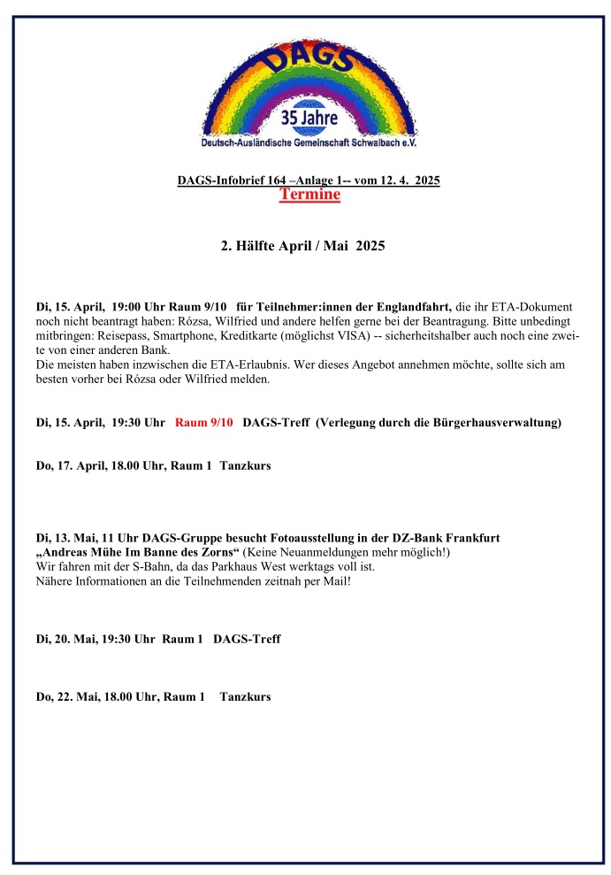 Adresse:Deutsch-Ausländische Gemeinschaft Schwalbach e.V.Danziger Str. 165824 Schwalbach am Taunus E-Mail-Adresse:Deutsch-Ausländische Gemeinschaft Schwalbach e.V. Bankverbindung:Deutsch-Ausländische Gemeinschaft Schwalbach e.V.TaunussparkasseIBAN:DE43 5125 0000 0049…