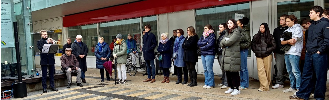 Der israelisch-russische Trompeter Efim Benevich eröffnete die Versammlung mit Musik von Ravel. DAGS-Vorsitzender Wilfried Hülsemann erinnerte kurz an die Ereignisse, die zu der Gewaltorgie geführt hatten und lud die Anwesenden ein, an das Mikrofon zu treten und eige-ne Gedanken oder passende Berichte vorzutragen.