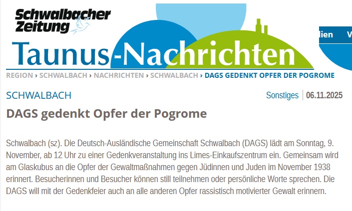DAGS gedenkt Opfer der Pogrome Beitragsnavigation DAGS-Infobrief 167 –Anlage 1– vom 19. 10. 2025 Schwalbacher Mahnwache 2025